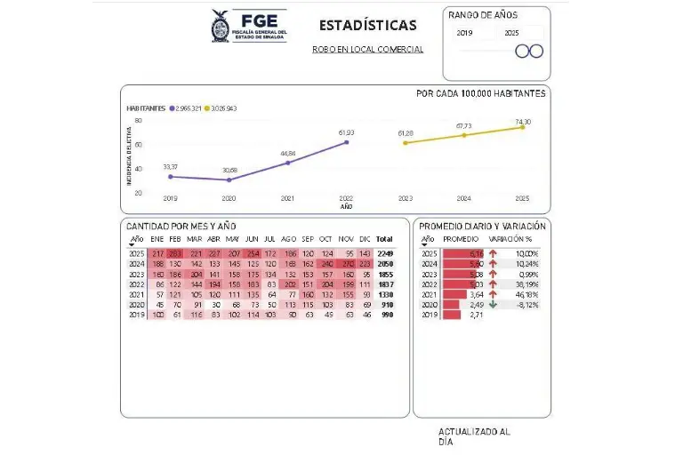 El delito de robo a comercios en Sinaloa alcanzó niveles sin precedentes durante 2025, según cifras oficiales de la Fiscalía General del Estado (FGE). El aumento sostenido de estos hechos delictivos representa un reto importante para la seguridad pública y la economía local, especialmente para pequeños y medianos negocios. De acuerdo con el informe estadístico, al cierre del ciclo de 2025 se registraron 2,249 robos a locales comerciales, la cifra más alta documentada en los últimos siete años. Estas cifras reflejan un promedio de 6.16 robos por día en el estado en el año pasado.